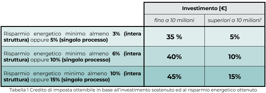 4- Semplificazione del calcolo dei risparmi nel caso di sostituzione di beni ‘obsoleti’, ovvero che abbiano completato da oltre 24 mesi il loro piano di ammortamento alla data di presentazione della richiesta del Credito d’Imposta: in questo caso viene ‘presunto’ il raggiungimento della soglia minima di risparmio richiesta per accedere al meccanismo (vd. Tabella 1). L’impresa può comunque decidere di dimostrare il raggiungimento di un risparmio energetico superiore a quello minimo per beneficiare di un’aliquota più elevata.
