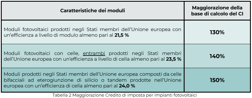 2- Rafforzamento delle aliquote maggiorate previste per investimenti in impianti fotovoltaici, in modo da aumentare la competitività dei moduli di provenienza Europea rispetto ai concorrenti di manifattura cinese (ad oggi ancora più economici e con prestazioni comunque elevate):